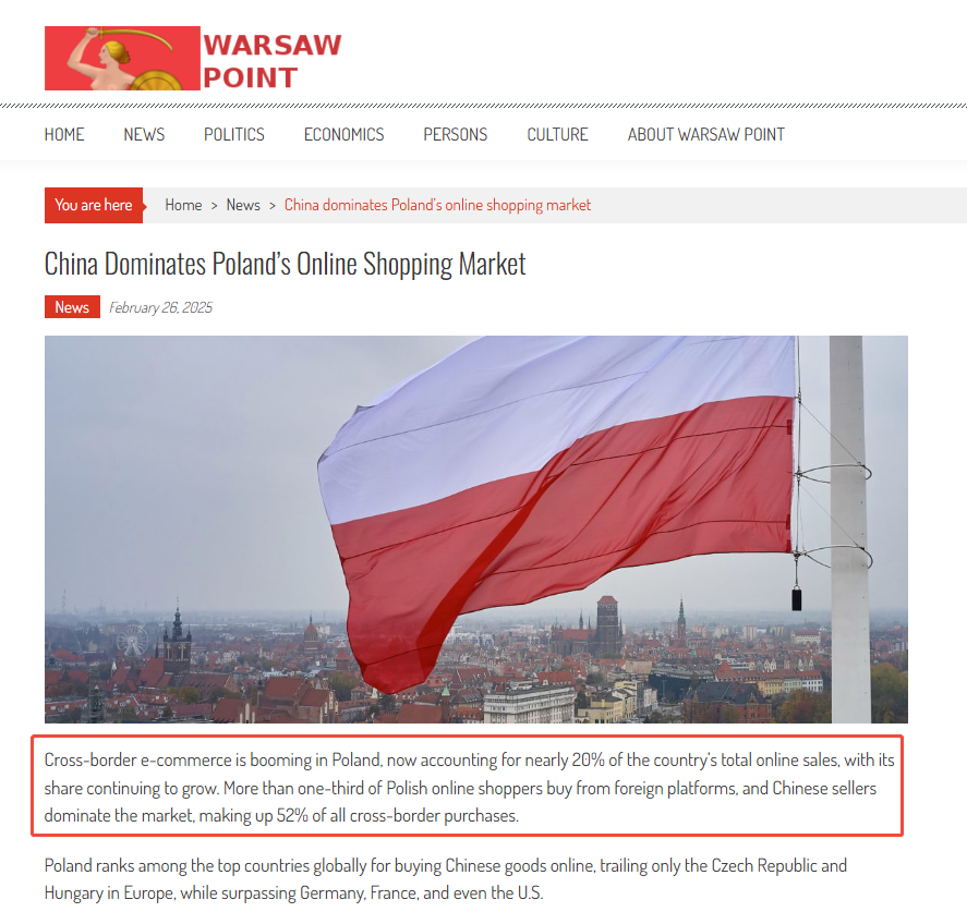 Cross-border e-commerce has become an important growth engine for online retail in Poland, accounting for nearly 20% of total e-commerce sales and continuing to increase. Chinese products hold a significant advantage in Poland's cross-border channels, with about 52% of cross-border goods coming from China, performing particularly well in high cost-performance categories such as home, beauty, and gardening.