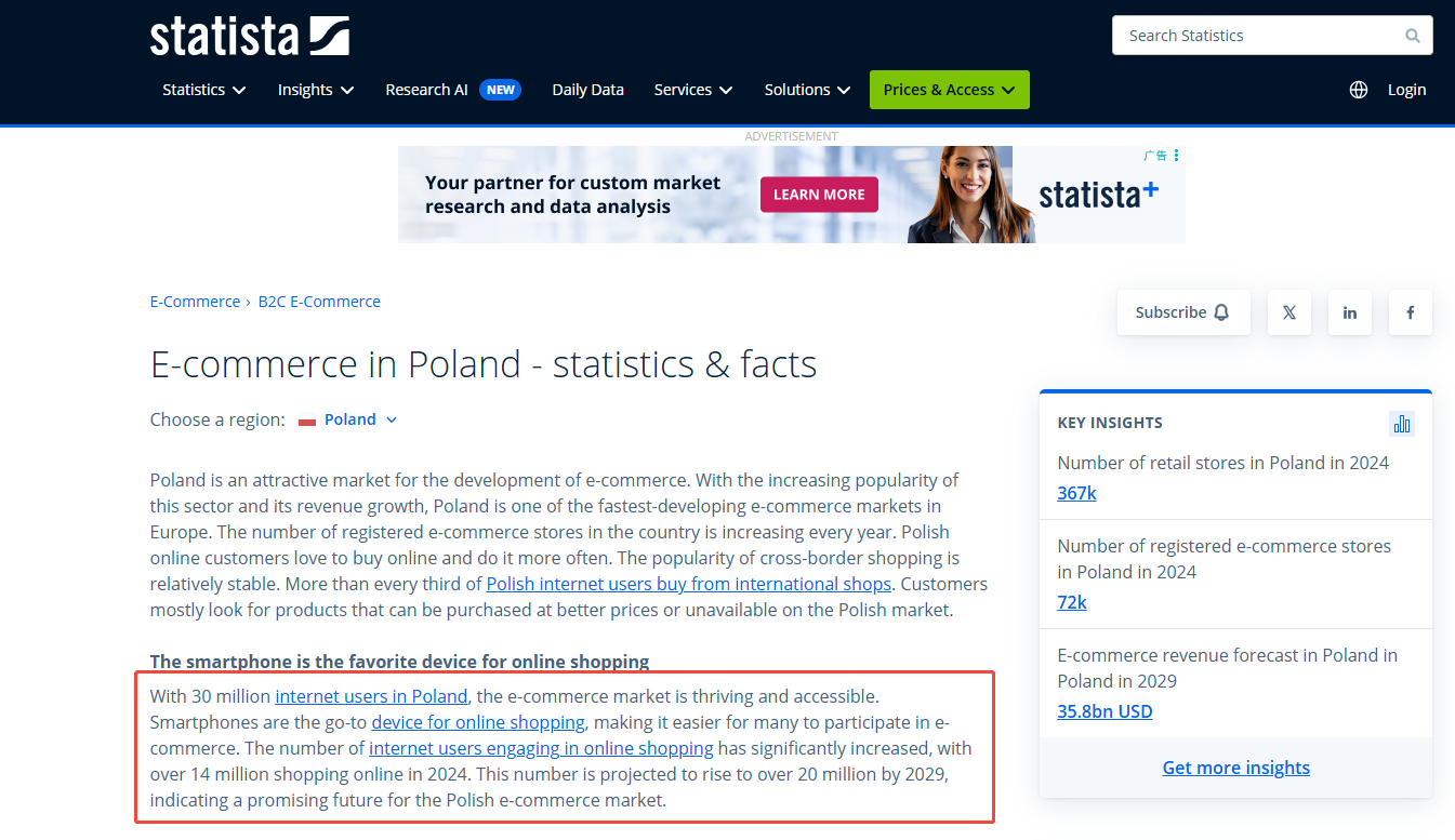 According to Statista, the number of internet users in Poland is about 30 million, with an internet penetration rate of nearly 96% among people aged 7 to 75. Online retail continues to expand, and it is expected that e-commerce market revenue will surpass $35 billion by 2029.