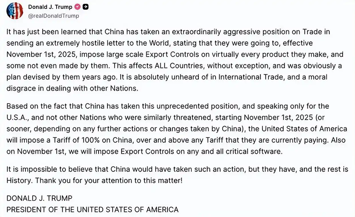 美国总统特朗普10月10日在社交平台表示,拟于11月1日起对华商品追加100%关税,全球贸易的神经再次紧绷。