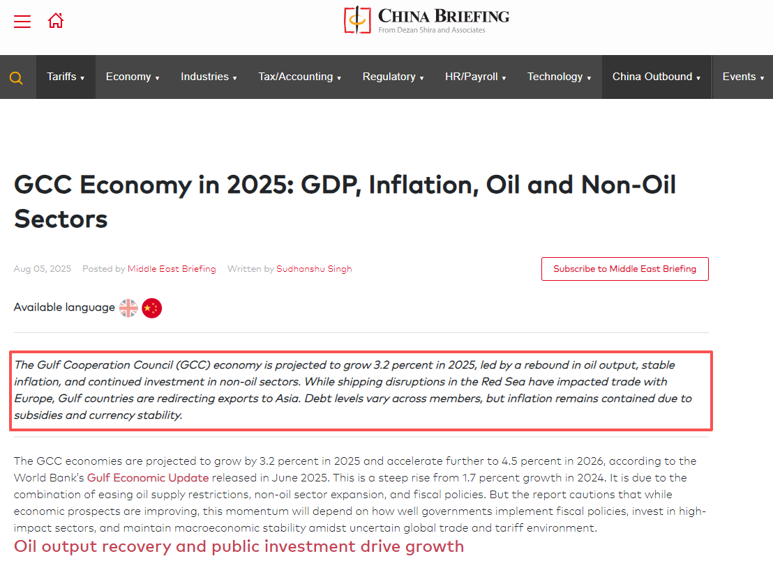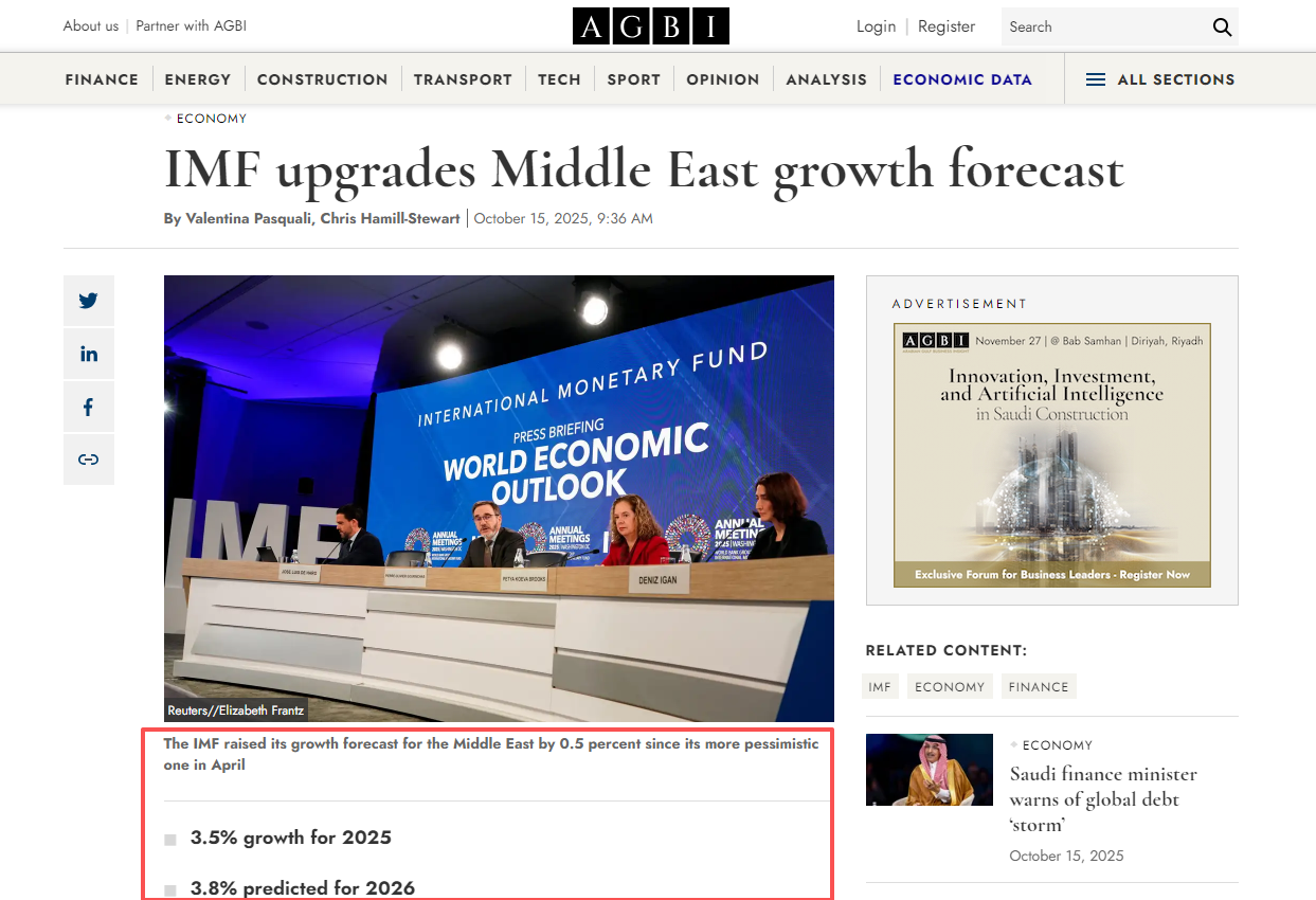 国际货币基金组织(IMF)发布在2025年将中东及中亚区域经济增长预期上调至3.5%,并预计2026年将进一步提升至 3.8%。