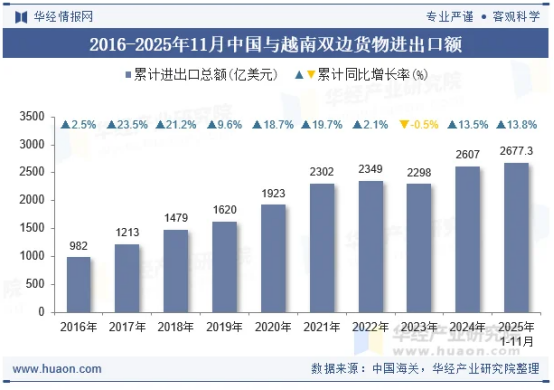 图:2016-2025年11月中国与越南进出口商品总值