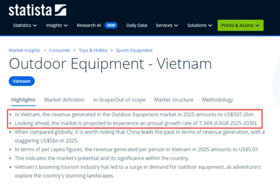 截至2025年,越南户外休闲及运动用品市场规模预计将达到5亿至8亿美元,年复合增长率约为7.3%,是东南亚增长最快的市场之一。