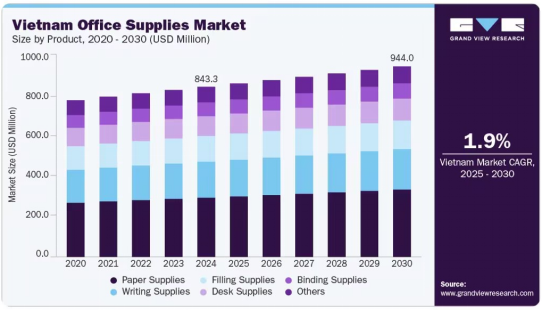 企业办公空间扩张与教育需求增长,推动办公用品市场稳步发展。该市场预计2025—2030年复合增长率约1.9%,纸品文具、文件夹、档案架占据主要份额。同时,越南礼品市场节庆属性突出,消费者更偏好高性价比、具设计感的节日装饰、文创产品与桌面摆件。