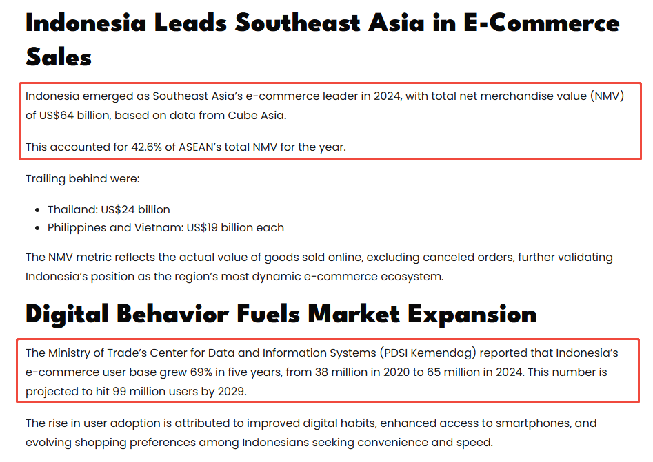 作为东南亚第一大经济体,印尼拥有区域内规模最大、结构最年轻的人口基盘。更重要的是,这不是“潜力型红利”,而是已经开始兑现的消费力。近年来,电商平台高速扩张,Shopee、Tokopedia等平台持续放量。2024年网上交易总额(NMV)达约640亿美元,占整个东盟电商市场的42.6%。