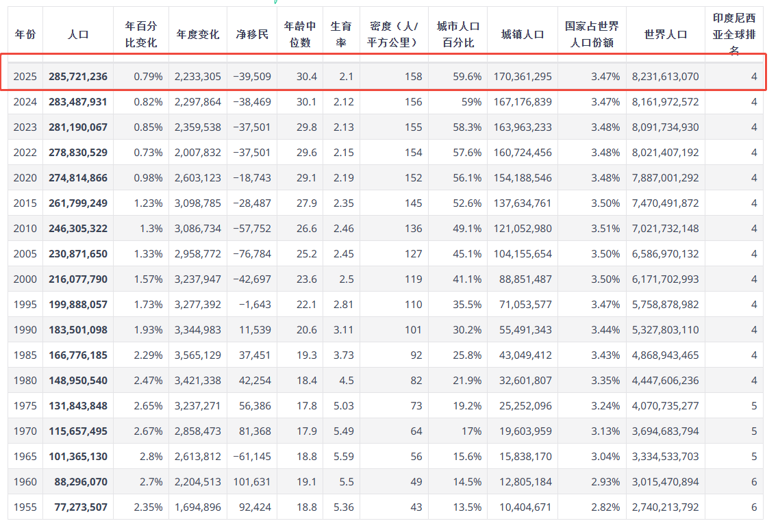 2025年印尼人口预计达2.857亿,占全球人口约3.47%,为消费市场奠定超大规模基座。