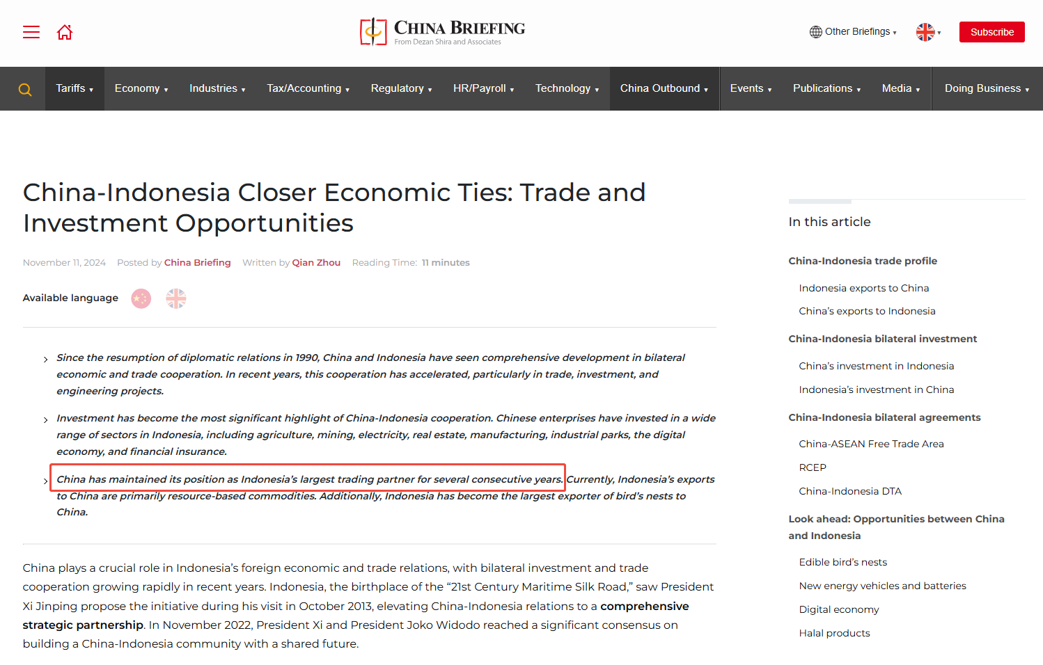 ▲中国已经连续多年保持印尼最大贸易伙伴的地位