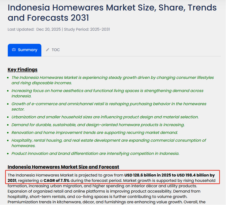 随着城市化推进,以及小户型、单身与小家庭数量持续增长,印尼消费者对轻量化、易收纳、兼具颜值与实用性的家居日用品需求显著提升。家庭用品(homewares,涵盖厨房用品、收纳系统、家居装饰等)市场预计将从2025年的约1286亿美元增长至2031年的约1984亿美元,年复合增速约7.5%。