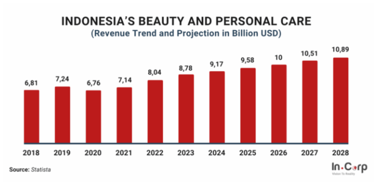 印尼美容与个人护理市场持续扩张,主要受城市化进程、年轻人口结构以及数字消费习惯的推动。化妆品市场总收入已达91.7亿美元,预计到2028年将接近100亿美元。