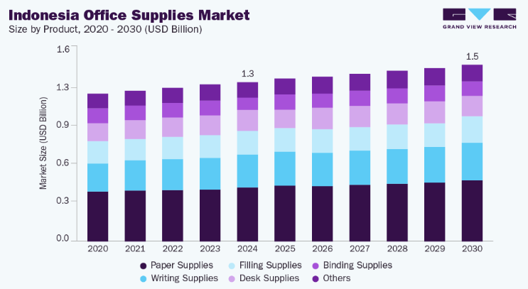 印尼办公用品市场规模预计2025年至2030年复合年增长率为1.7%。市场增长一部分来源于教育市场对基础文具用品的长期刚需,以及企业对办公与品牌礼品类采购的稳定需求。纸张、笔记本、便签本、马克笔、荧光笔、高端书写工具等基础品类保持稳健增长。