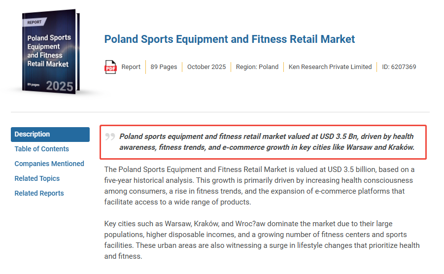 相关数据显示,波兰户外装备市场预计于2025年实现约3260万美元收入,并有望在2030年增长至约4456万美元,整体呈现出快于传统消费品的扩张节奏。