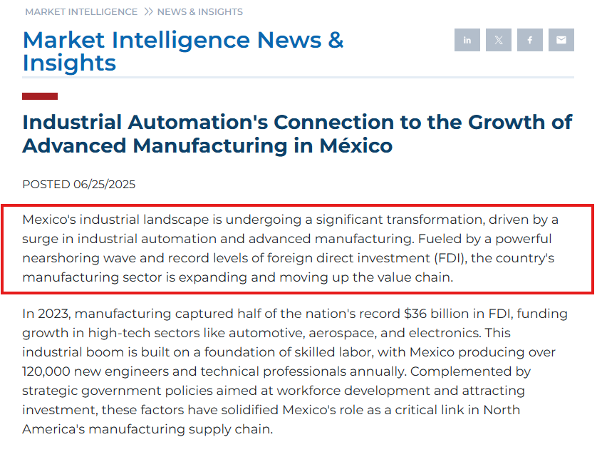 稳定的宏观经济和鼓励外资的政策,为外来投资者提供了安全的土壤。墨西哥政府与全球超过50个国家签订了自由贸易协定,在这里生产的产品可以辐射更广阔的市场。凭借《美墨加协定》(USMCA)的关税中性优势,成为辐射北美市场的“黄金跳板”。入驻墨西哥不仅能依托其成熟供应链覆盖本土需求,更可借助“零关税”通道快速进入美国、加拿大市场,实现“一地布局,三国盈利”的高效扩张。