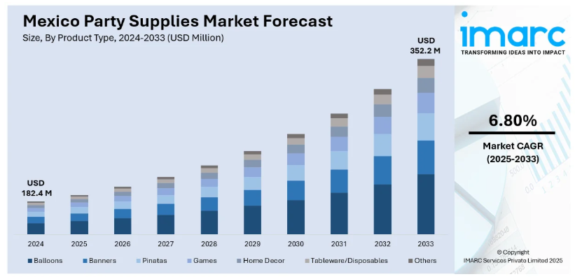 墨西哥礼品及办公用品市场需求稳定、消费频次高,是拉美地区极具确定性的消费型市场之一。IMARC Group数据显示,2024年墨西哥派对用品市场规模约1.82亿美元,预计到2033年增长到3.52亿美元左右。浓厚而持续的节日文化是市场扩张的核心动力。亡灵节、圣诞节、复活节及生日派对、校园活动等场景贯穿全年,持续拉动装饰品、主题礼品、派对布置等产品的集中消费。
